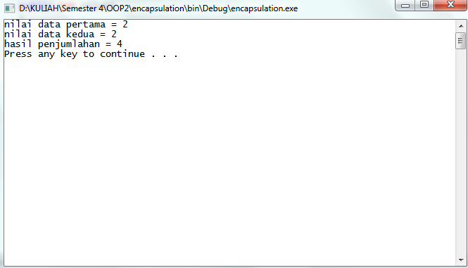 Enkapsulasi merupakan suatu cara pembungkusan data dan method yang menyusun suatu kelas sehingga kelas dapat dipandang sebagai suatu modul dan cara bagaimana menyembunyikan informasi detail dari suatu class (information hiding). Dalam OOP, enkapsulasi sangat penting untuk keamanan serta menghindari kesalahan permrograman, pembungkus disini dimaksudkan untuk menjaga suatu proses program agar tidak dapat diakses secara sembarangan atau di intervensi oleh program lain. Konsep enkapsulasi sangat penting dilakukan untuk menjaga kebutuhan program agar dapat diakses sewaktu-waktu, sekaligus menjaga program tersebut.