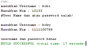 System.out.println("#user name dan atau password salah!");